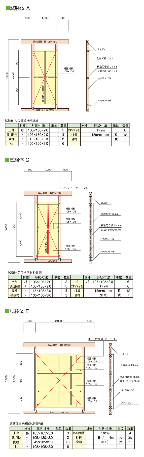 ・A1~A3、C2~C4、E1~E3の試験体の開発は、耐震補強が必要な住まい手に対しての費用の軽減を図る事を目的としています。